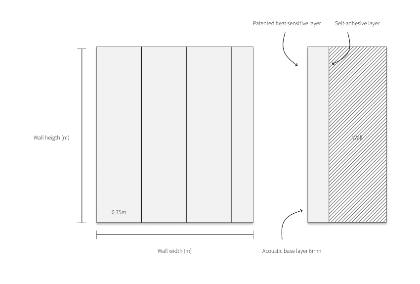 The acoustic baselayer has a self-adhesive backing that will stick to almost any wall. The seamless toplayer can be ironed onto the acoustic backing. A patented thermo-activated layer has been added to the product.